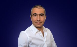 Edouard Senhaji, Head of Sophis Services, a dark-haired professional smiling at the camera against a wide blue header